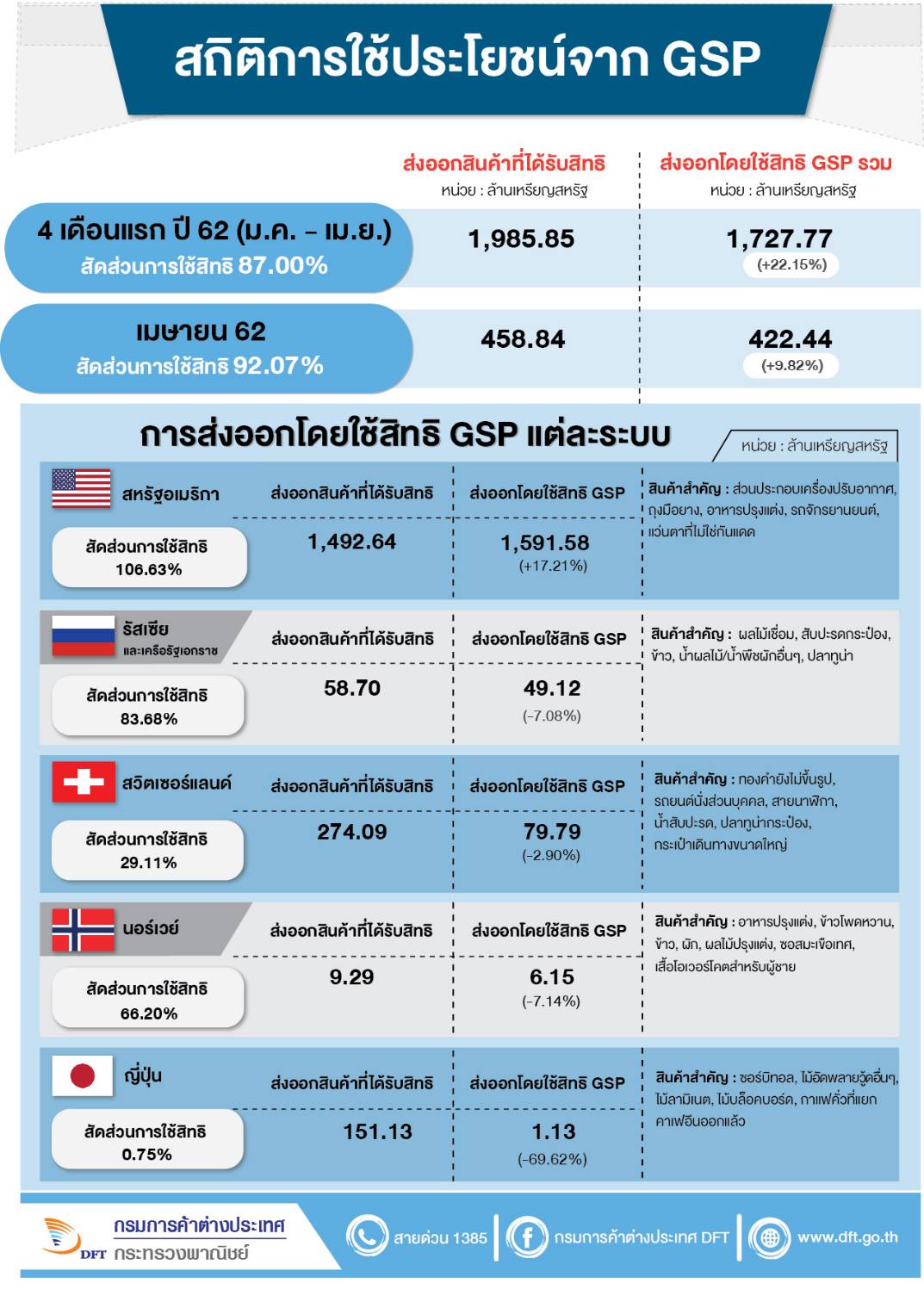 ส่วนของการใช้สิทธิประโยชน์ภายใต้ GSP จำนวน 4 ระบบ ประกอบด้วย สหรัฐฯ สวิตเซอร์แลนด์ รัสเซียและเครือรัฐเอกราช และนอร์เวย์ (ญี่ปุ่นตัดสิทธิการให้ GSP แก่ไทยตั้งแต่วันที่ 31 มี.ค.2562) มีมูลค่า 1,727.77 ล้านเหรียญสหรัฐ เพิ่มขึ้น 22.15% มีอัตราการใช้สิทธิ ร้อยละ 87 ของมูลค่าการส่งออกที่ได้รับสิทธิ GSP โดยสหรัฐฯ ยังคงมีสัดส่วนการใช้สิทธิมากที่สุด คือ ร้อยละ 92 ของมูลค่าการใช้สิทธิ GSP ทั้งหมด มีมูลค่า1,591.58 ล้านเหรียญสหรัฐ เพิ่มขึ้น 17.21% มีอัตราการใช้สิทธิร้อยละ 106.63 ของมูลค่าการส่งออกที่ได้รับสิทธิ GSP ซึ่งมีมูลค่า 1,492.64 ล้านเหรียญสหรัฐ โดยสินค้าที่มีมูลค่าการใช้สิทธิประโยชน์ฯ สูงสุด 5 อันดับแรก ได้แก่ ส่วนประกอบเครื่องปรับอากาศ ถุงมือยาง อาหารปรุงแต่ง รถจักรยานยนต์ และแว่นตาที่ไม่ใช่กันแดด