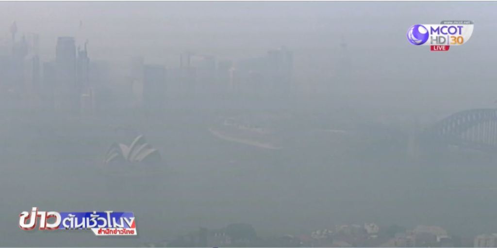สื่อท้องถิ่นระบุมลพิษทางอากาศเพิ่มขึ้นจนอยู่ในระดับที่เป็นอันตรายต่อสุขภาพ คาดว่าหมอกพิษจะยังคงปกคลุมนครซิดนีย์ และพื้นที่โดยรอบอีกหลายวัน.