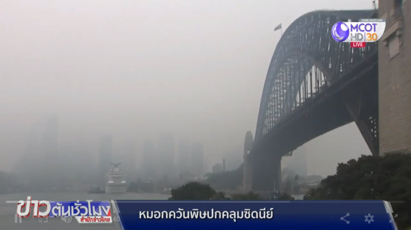 ทัศนียภาพโรงละครโอเปร่าเฮาส์ และสะพานฮาเบอร์ บริดจ์ สัญลักษณ์ของนครซิดนีย์ ถูกบดบังอย่างสิ้นเชิงด้วยหมอกควันพิษจากไฟป่าที่กำลังปกคลุมรัฐนิวเซาท์เวลส์ทั้งรัฐ