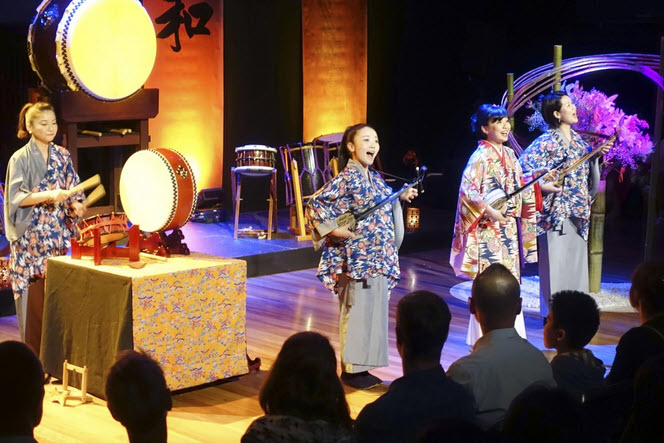 About 400 people came to see the two-hour performance featuring taiko drummers and Okinawa sanshin string instrumentalists, along with non-instrumental performances by swordsmen and kimono-clad traditional dancers for the one-night-only show.