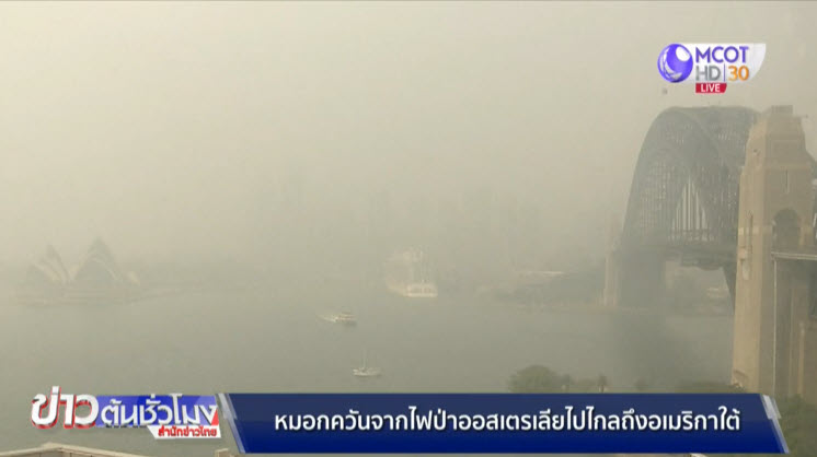 สถานการณ์ไฟป่าในออสเตรเลียยังคงวิกฤติ ส่งผลให้นครซิดนีย์ถูกหมอกควันหนาทึบปกคลุมอีกครั้งในวันนี้ ขณะที่ทั่วรัฐนิวเซาท์เวลส์ยังคงมีไฟป่าอยู่ถึง 119 จุด ไฟป่าที่เริ่มปะทุมาตั้งแต่เดือนกันยายนปีที่แล้ว คร่าชีวิตประชาชนไปแล้ว 25 คน บ้านเรือน 2,000 หลังถูกไฟเผาราบคาบ และพบว่าพื้นที่ไฟป่าในครั้งนี้มีบริเวณกว้างกว่ารัฐแมรีแลนด์ของสหรัฐถึง 2 เท่า ไฟป่าที่ลุกไหม้เป็นเวลานานและกินพื้นที่มหาศาล ส่งผลให้หมอกควันจากไฟป่าในออสเตรเลียลอยไปไกลจนถึงภูมิภาคอเมริกาใต้ ซึ่งอยู่ห่างจากออสเตรเลียถึง 11,000 กิโลเมตร.