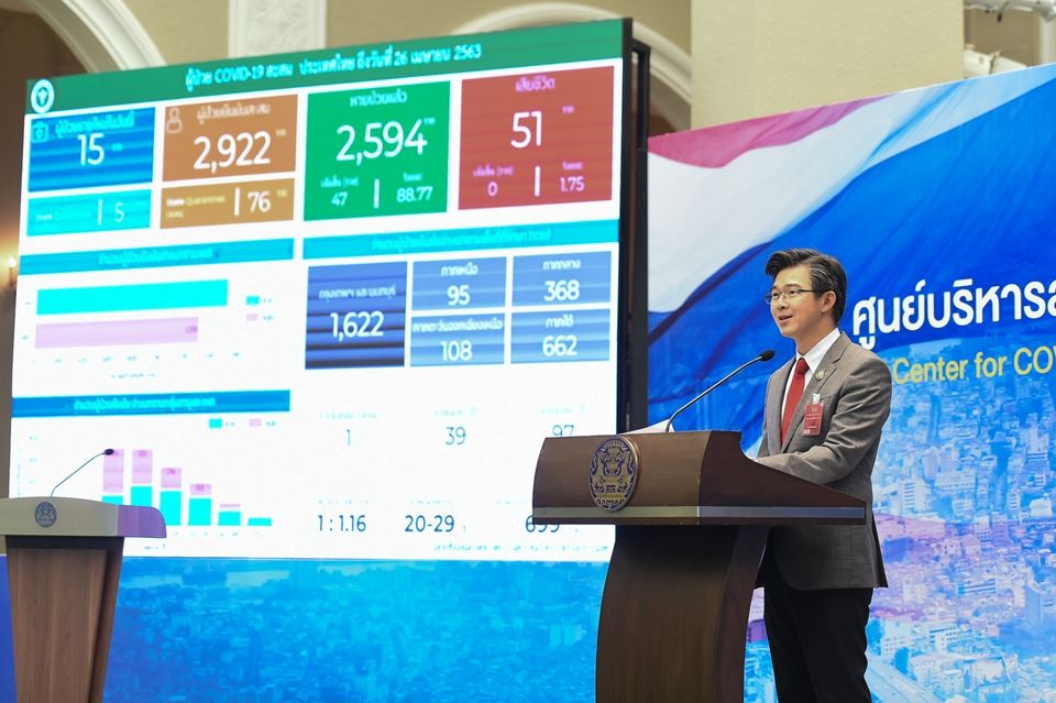 น.พ.ทวีศิลป์ วิษณุโยธิน โฆษกศูนย์บริหารสถานการณ์โควิด-19 หรือ ศบค. แถลงชี้แจงสถานการณ์การแพร่ระบาดของเชื้อไวรัสโควิด – 19 ว่าในวันนี้ (26 เม.ย.) พบผู้ติดเชื้อไวรัสโคโรนา หรือโควิด-19 เพิ่ม 15 คน จากการสัมผัาผู้ติดเชื้อ ไปในสถานที่ชุมชน และการค้นหาเชิงรุก ซึ่งจำนวนดังกล่าว พบในสถานที่กักตัวโดยรัฐ จำนวน 5 คน ไม่พบผู้ป่วยจากแรงงานข้ามชาติเพิ่ม ทำให้มีผู้ป่วยสะสม 2,922 คน มีผู้ป่วยที่รักษาหายเพิ่มขึ้น 47 คน รวมผู้ป่วยที่รักษาหายแล้ว 2,594 คน เหลือผู้ป่วยที่กำลังรักษาตัวอยู่ 277 คน โดยในวันนี้ไม่มีผู้เสียชีวิต ทำให้มีผู้เสียชีวิตคงที่ที่ 51 ราย