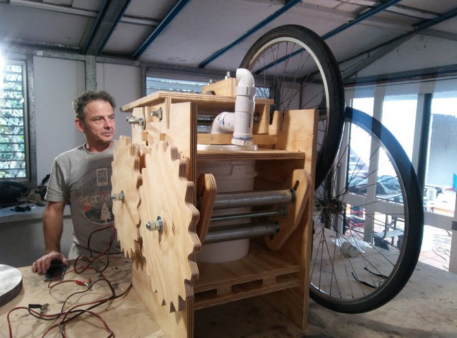 Canning’s prototype uses a small scooter motor to power the rotating paddles, but he said he’s also used a second-hand ceiling fan and said people could also turn the paddles by hand, or attach them to a bicycle and use peddle power.