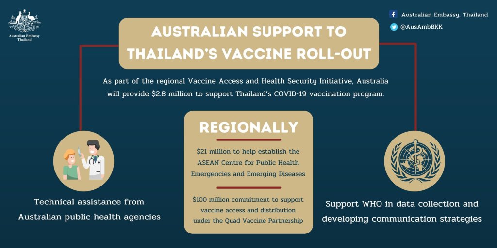 Australia is pleased to provide $2.8 million to support Thailand’s rollout of COVID-19 vaccines, as part of Australia’s regional Vaccine Access and Health Security Initiative.This funding will go towards the provision of technical assistance from the Australian Therapeutic Goods Administration and the National Centre for Immunisation Research and Surveillance.It will also support the World Health Organization in their work to improve vaccine-related data collection systems in Thailand and to develop communication strategies to improve understanding and acceptance of COVID-19 vaccines.Thailand will also benefit from Australia’s broader support to the region, including $21 million to help establish the ASEAN Centre for Public Health Emergencies and Emerging Diseases, and our $100 million commitment to support vaccine access and distribution in Southeast Asia, under the Quad Vaccine Partnership.