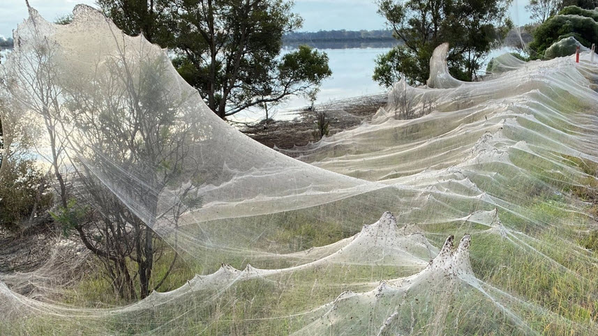 ผืนใยแมงมุมขนาดใหญ่ ปกคลุมต้นไม้ และพื้นที่ที่เพิ่งประสบเหตุน้ำท่วมในรัฐวิกตอเรีย ประเทศออสเตรเลียเป็นวงกว้าง โดยในบางจุดใยแมงมุมทอเป็นผืนต่อเนื่องยาวถึงกว่า 1 กิโลเมตร