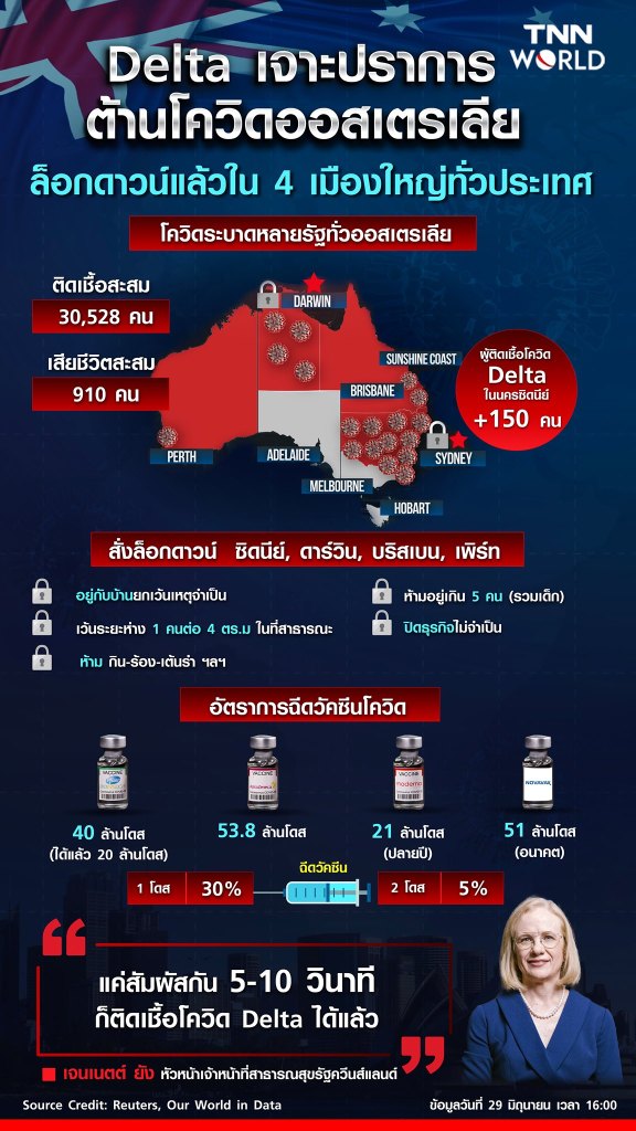 สำหรับการแพร่ระบาดของสายพันธุ์ Delta เวลานี้ ทำให้ต้องมีการออกคำสั่ง “ล็อกดาวน์” ทั้งใน “ซิดนีย์” (นิวเซาท์เวลส์), “ดาร์วิน” (นอร์เทิร์น ทอริทอรีย์), บริสเบน และเมืองเพิร์ท