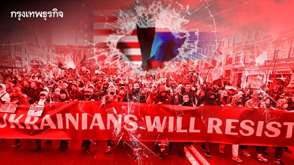 ขณะที่ชาวยูเครนหลายพันคนร่วมเดินขบวนในกรุงเคียฟ เมืองหลวงของยูเครน เพื่อแสดงความสามัคคีและความเข้มแข็ง ต่อต้านการคุกคามของรัสเซีย โดยผู้เดินขบวนร่วมกันตะโกนข้อความว่า “ชัยชนะเป็นของยูเครน” พร้อมถือธงชาติและถือป้ายที่มีข้อความว่า ‘ชาวยูเครนจะสู้กลับ’ และ ‘ไม่เอาปูติน’ เพื่อแสดงการต่อต้านรัสเซีย