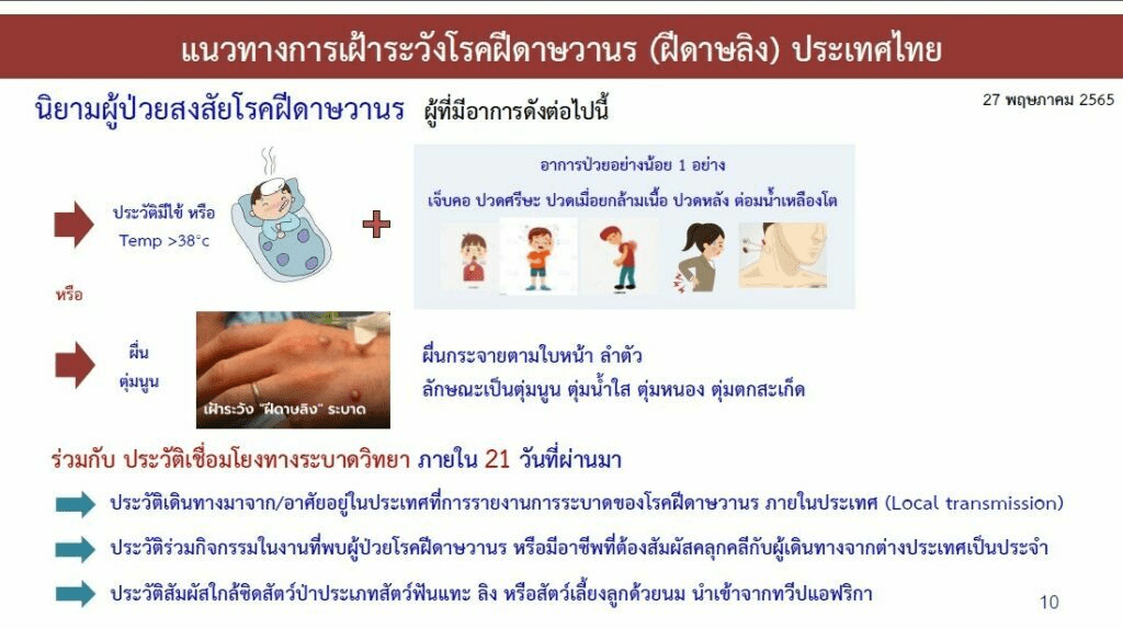 กระทรวงสาธารณสุข พบผู้ป่วยฝีดาษลิง 1 ราย ต่อเครื่องที่ไทย 2 ชั่วโมงก่อนไปออสเตรเลีย พบผู้สัมผัสใกล้ชิด แต่ยังไม่ใช่สัมผัสเสี่ยง 12 ราย ยืนยันเป็นโรคที่ไม่ได้ติดกันง่าย เชื้อไม่ลอยไปเอง ต้องสัมผัสกันโดยตรง