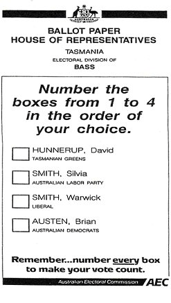 รูปที่ 2 ตัวอย่างบัตรเลือกตั้งในเขตแบส รัฐแทสมาเนีย (Bass Tasmania; ที่มา Parliament of Australia, 2007)