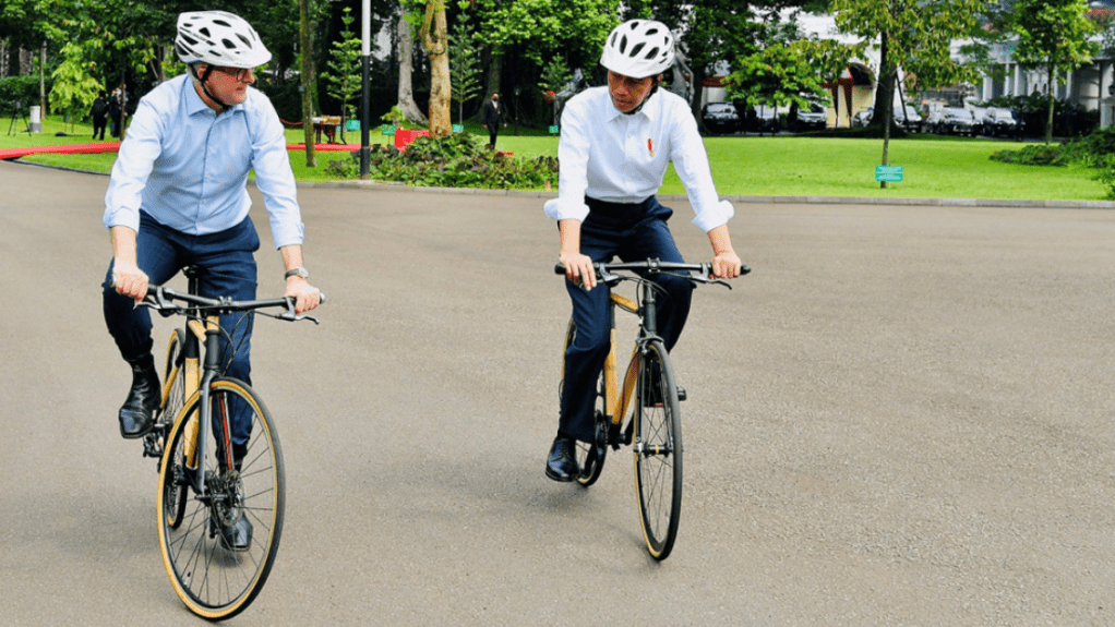 เมื่อช่วงต้นเดือน มิ.ย.ที่ผ่านมา มีภาพของประธานาธิบดีโจโก วิโดโด ของอินโดนีเซีย และนาย แอนโทนี อัลบานีซี นายกรัฐมนตรี คนใหม่ล่าสุดของออสเตรเลีย ขี่จักรยานไม้ไผ่ไปรอบๆ สวนเขียวชอุ่มของทำเนียบประธานาธิบดีอินโดนีเซีย ในเมืองโบกอร์ทาง ตอนใต้ของกรุงจาการ์ตา โดยผู้นำอินโดนีเซียยังมอบของขวัญที่ไม่ธรรมดาอย่างจักรยานไม้ไผ่ให้กับผู้นำออสเตรเลีย ในโอกาสที่มาเยือนอินโดนีเซียอย่างเป็นทางการ