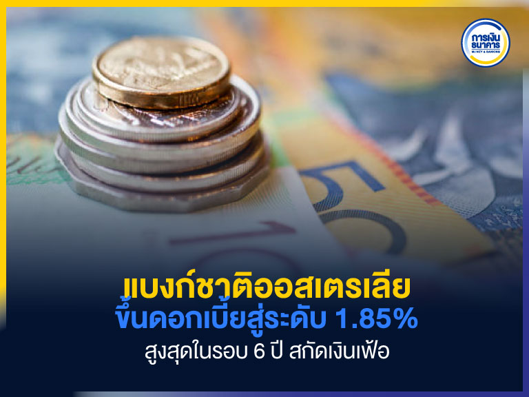 ธนาคารกลางออสเตรเลีย (RBA) ประกาศขึ้นอัตราดอกเบี้ยนโยบายอีก 0.50% สู่ระดับ 1.85% ในการประชุมวันนี้ ซึ่งเป็นระดับสูงสุดในรอบ 6 ปี และเป็นการปรับขึ้นดอกเบี้ยในการประชุม 4 ครั้งติดต่อกัน พร้อมกับส่งสัญญาณว่าอาจจะปรับขึ้นดอกเบี้ยอีกในวันข้างหน้า