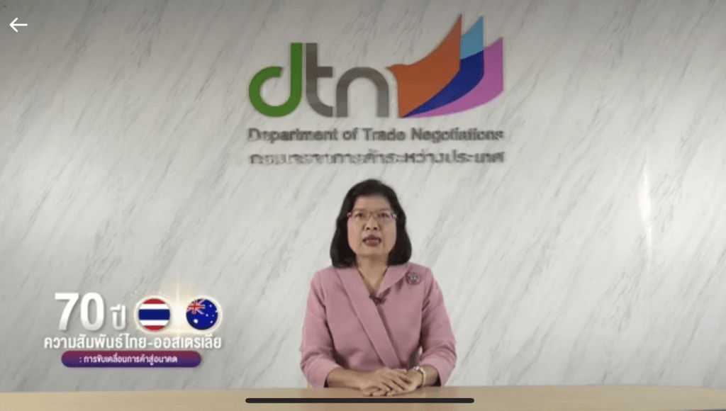นางอรมน ทรัพย์ทวีธรรม อธิบดีกรมเจรจาการค้าระหว่างประเทศ เปิดเผยว่า กรมได้จัดงานสัมมนาออนไลน์ เรื่อง “70 ปี ความสัมพันธ์ไทย-ออสเตรเลีย: การขับเคลื่อนการค้าสู่อนาคต” เมื่อวันที่ 28 กันยายน ที่ผ่านมา เพื่อฉลองความสัมพันธ์อันดีระหว่างไทยกับออสเตรเลียที่มีมาอย่างยาวนาน และจะครบรอบ 70 ปี ในเดือนธันวาคมนี้ โดยกรมได้เชิญวิทยากรและผู้เชี่ยวชาญจากภาครัฐและเอกชนร่วมถ่ายทอดความรู้เกี่ยวกับการค้าการลงทุนของออสเตรเลีย และข้อเสนอแนะการขับเคลื่อนการค้าไทย-ออสเตรเลียสู่อนาคต ซึ่งมีผู้เข้าร่วมงานสัมมนากว่า 300 คน