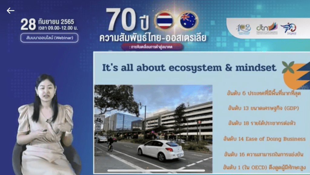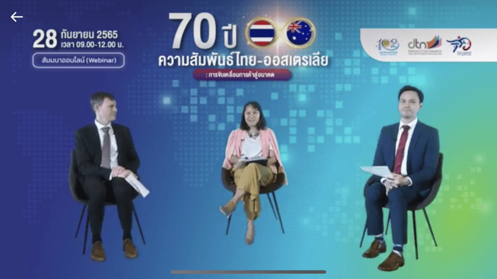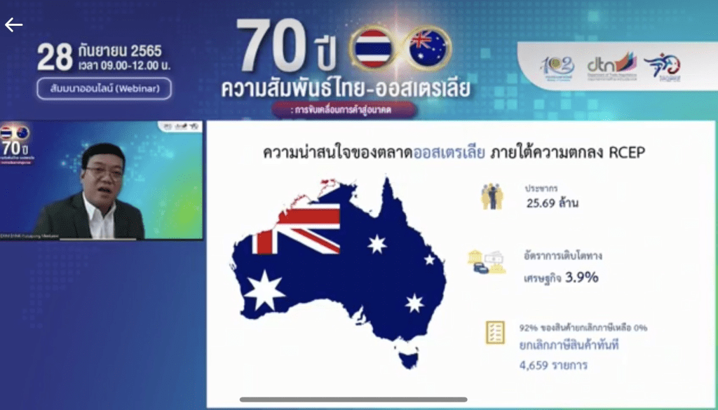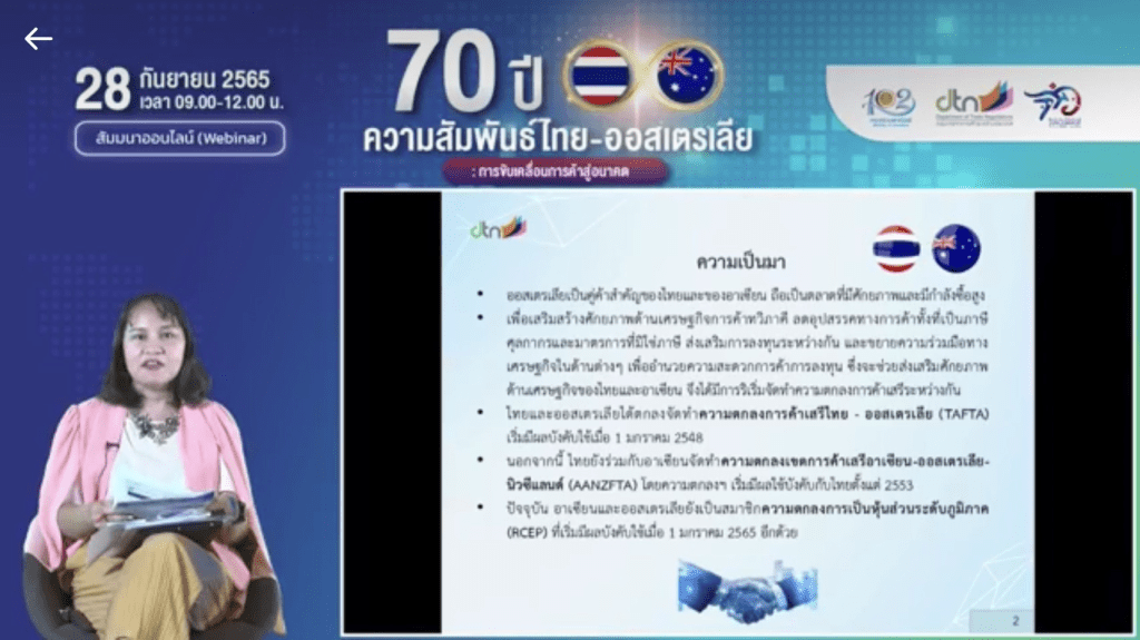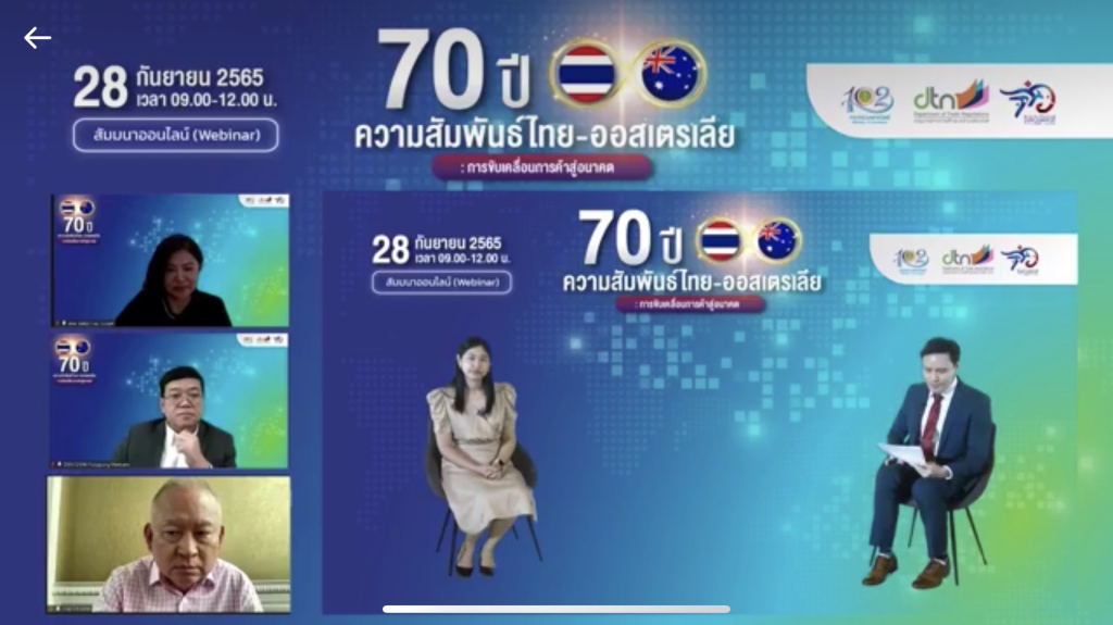 กรมเจรจาการค้าระหว่างประเทศ จัดสัมมนาออนไลน์ ฉลองความสัมพันธ์ไทย-ออสเตรเลีย ครบรอบ 70 ปี นำกูรูถ่ายทอดความรู้การขับเคลื่อนการค้าการลงทุนสู่อนาคต พาณิชย์ไทยและออสเตรเลียอยู่ระหว่างจัดทำยุทธศาสตร์ความร่วมมือทางเศรษฐกิจ ชี้! จะช่วยส่งเสริมการค้าการลงทุนระหว่างกัน แนะผู้ประกอบการไทยพัฒนาทักษะแรงงาน มาตรฐานสินค้า ศึกษาตลาดของออสเตรเลีย และนำมาปรับใช้ในการประกอบธุรกิจ